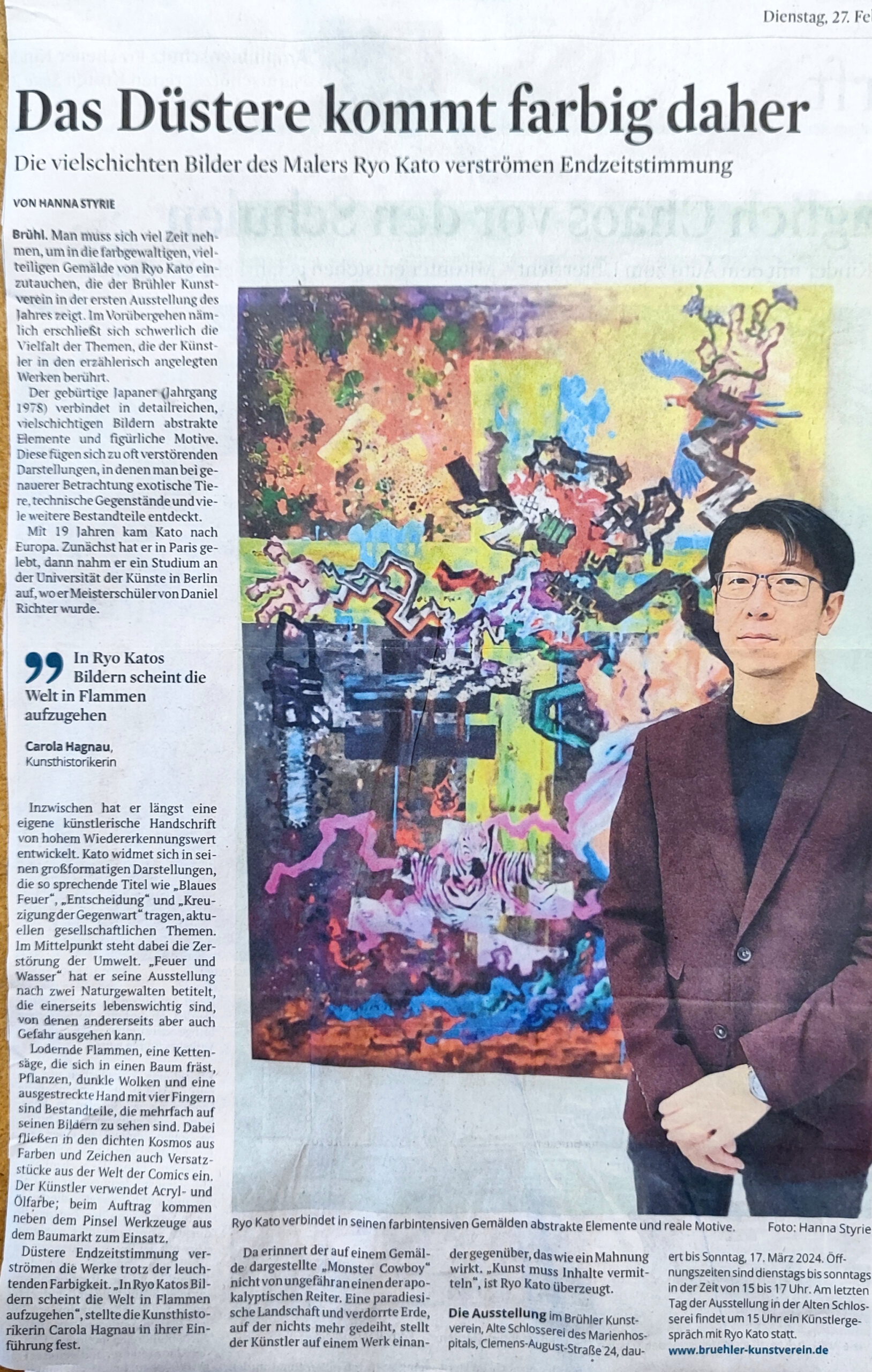 加藤竜、スターアーティストのダニエル・リヒターのマイスターシューラーで、最初の印象では彼らの間にいくつかの共通点を感じさせられる。彼の師(ダニエル・リヒター)は彼の元生徒(加藤竜)のように世界を批判する。しかし加藤は過激なのモチーフを好む。吐く猫、毛皮となったヒョウ、火薬庫に座る、または破壊された森を歩く猿、悪魔、マスク、亡霊、アポカリティスティックなジョッキーのない馬が行くシーン。 血なまぐさい本、串刺しのハンバーガー、煙が立ち上る工業の残骸、砂浜に打ち上げられた鳥なども、この爆発的な絵画の中に現れる。