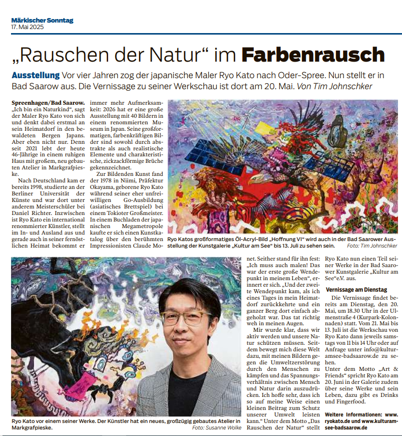 オープニングは5月20日火曜日、午後6時30分からウルメンシュトラーセ4(クアパーク・コロナーデ)で行われます。5月21日から7月13日まで、加藤竜の作品展は毎週土曜日の午前11時から午後2時まで、またはinfo@kultur-amsee-badsaarow.deにて予約によりご覧いただけます。「アート&フレンズ」というテーマのもと、加藤竜は6月20日にギャラリーで自身の作品や人生について話す予定で、その際にはドリンクやフィンガーフードも提供されます。