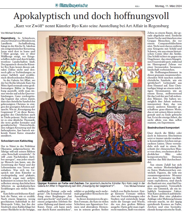 日独アーティストの加藤竜は、この聖なるサイクルには馴染みがないが、彼の色彩豊かで物語性のある豪快な絵にはつながりがある。ベルリン近郊に住む加藤が、4月中旬までレーゲンスブルクで初めて大作絵画を展示するアート・アフェア・ギャラリーでは、このような相互のつながりに繰り返し遭遇する。それは、キリスト教のシンボルである十字架にかけられたキリストが、展示作品のいくつかに登場することからも見て取れる。「現在の磔刑V」でもそうだが、このキリスト教の聖画のタイトルにも現れている。最終的には、形式的にも創作的にも大きな違いがあるにもかかわらず、穏やかな「十字架の道」と爆発的な色彩でほとんどバロック的な加藤の芸術を近づけているのは、同じようなテーマがあるからである。